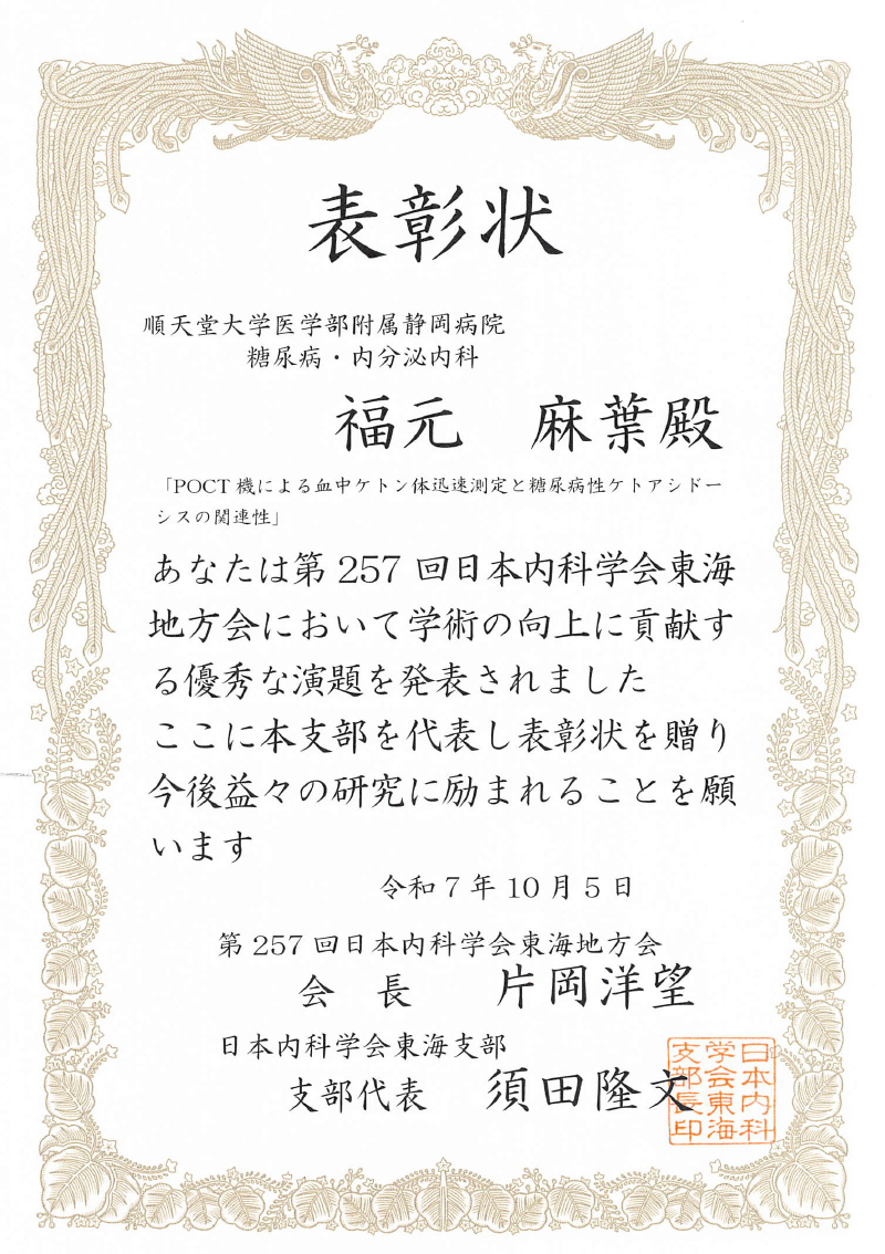 福元麻葉医師が第257回日本内科学会東海地方会で優秀な発表をしたとして表彰されました。
