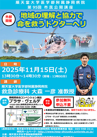 順天堂大学医学部附属静岡病院 第95回市民公開講座 『地域の理解と協力で命を救うドクターヘリ』 講師:救急診療科 准教授 大森 一彦 先生 |