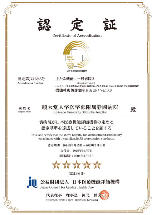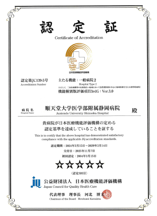 信頼される病院であるために、当院は医療の質向上の取り組みとして、公益財団法人日本医療機能評価機構が定める病院機能評価の認定を受けています。