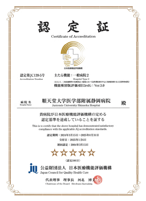 信頼される病院であるために、当院は医療の質向上の取り組みとして、公益財団法人日本医療機能評価機構が定める病院機能評価の認定を受けています。