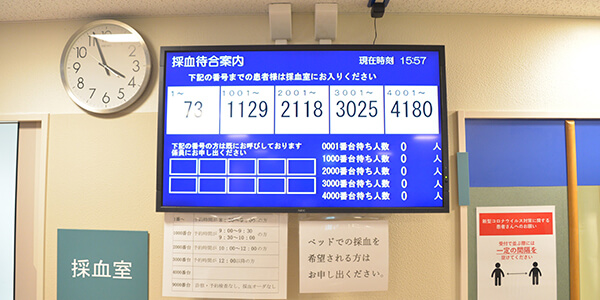 生化学検査、血液検査などに用いる血液を採取します。他に尿、ピロリ菌検査案内や糖負荷による採血も行っています。当院では採血の順番を診察予約順に振り分けております。