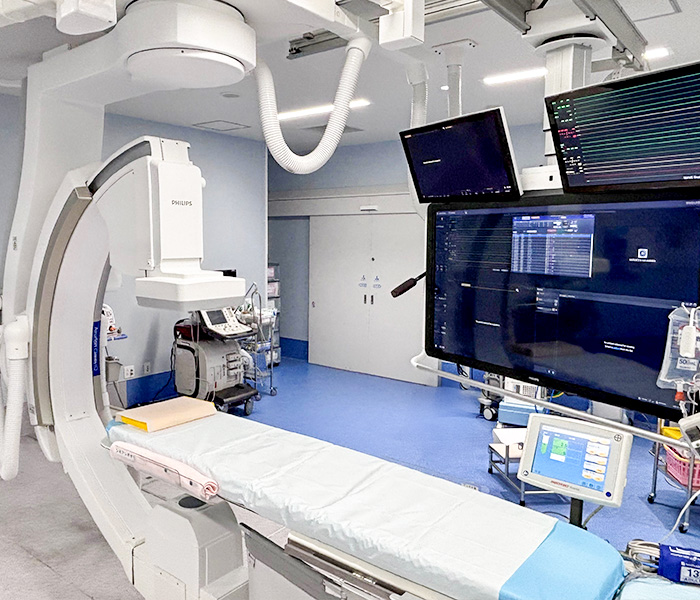 特に当院では急性冠症候群とした緊急カテーテル治療に精力的に取り組んでおり、年間500-600件 (うち、急性冠症候群に対する緊急治療 約200-250件、待機的治療約300-350件)の冠動脈カテーテル治療をおこない、最新のデバイスを用いることで良好な成績を示しています。不整脈治療にも力を入れており、カテーテルアブレーション年間約250件、ペースメーカー・デバイス治療約200件の実績を有しています。