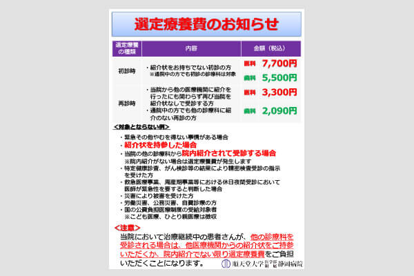 初診扱いで紹介状をお持ちではない場合は、初診時選定療養費として7,700円をお支払い頂いております。