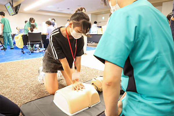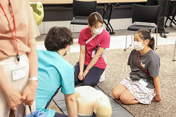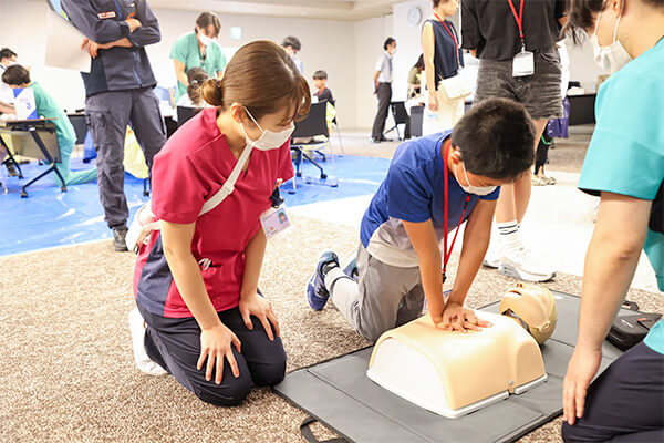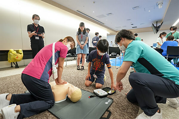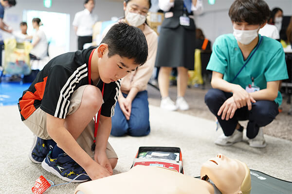 実際の講習会等で使用されるAEDのデモ機と人形を使って、心肺蘇生とAEDの使い方を体験。看護師の指導の下、子どもたちは一生懸命取り組んでいました。
