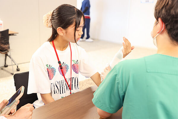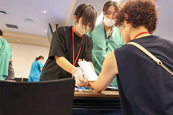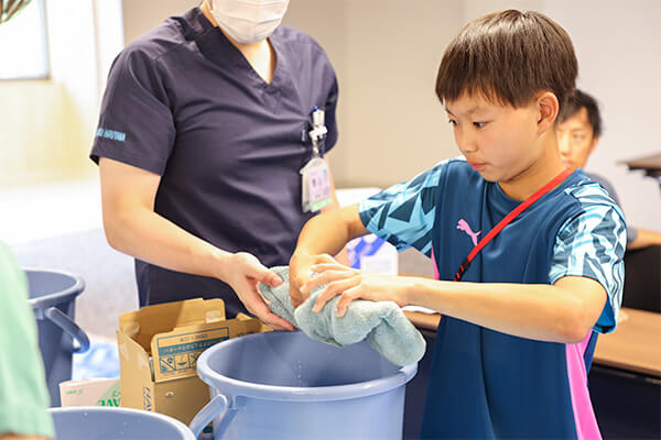 水に浸すと固まる特殊な素材を使ったギプス固定体験。固定された姿を見せ合い、微笑ましい場面が多くみられました。子どもたちには包帯を巻くコツも伝授されました。