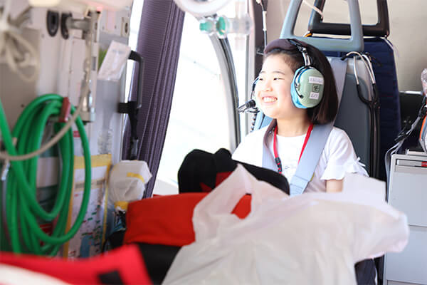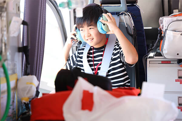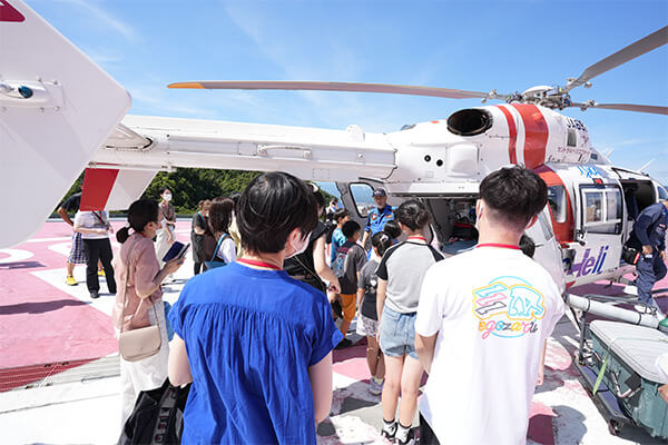 救急コール「コード・ブルー」に対応し救急現場へいち早く医師・看護師を連れていくドクターヘリ。機内には初期治療に必要な医療機器や医薬品がズラリと並び、普段見ることのできない光景に子どもたちは目が釘付けに。出動は年間約1,000件を超えると知り更にびっくり!