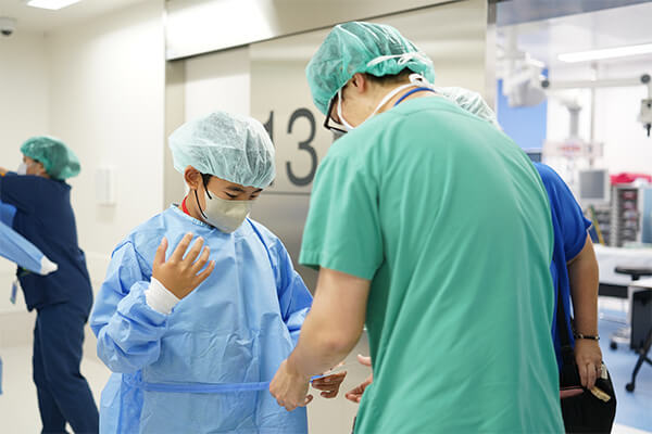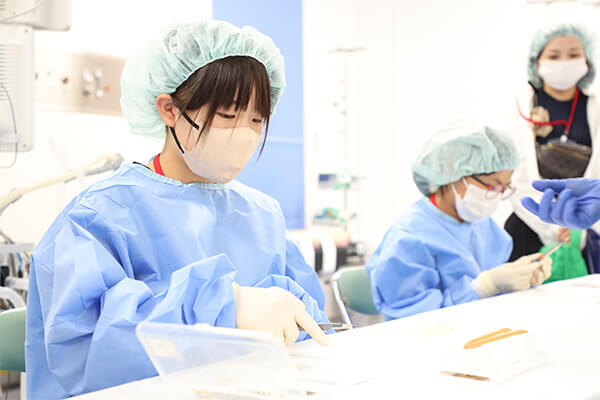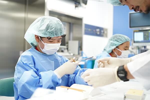 実際の手術室で行われた手術体験では、手術着・手袋を装着。皮膚に見立てた練習用パッドに執刀し、悪戦苦闘しながら縫合の糸結びまでやり切りました。