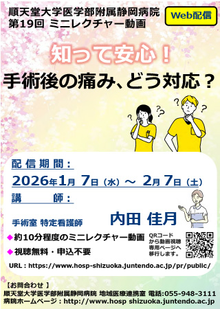 順天堂大学医学部附属静岡病院 ミニレクチャー動画 「知って安心!手術後の痛み、どう対応?」 講師:手術室 特定看護師 内田 佳月 |